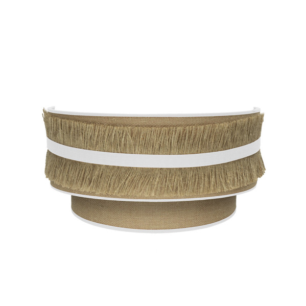 Aplique de la serie NATALIA, formado por dos cuerpos confeccionados en tela de SACO y tela de lino rayado de color BLANCO. Posee un portalámparas E27. Bombilla no incluida. Destaca por su pasamanería de flecos y cinta de colores, resultando una serie moderna y muy decorativa. Ideal para dormitorios, entraditas, salones y salas de estar, compatibles tanto con decoraciones rústicas como clásicas o vintage. Tiene unas dimensiones de 17x30x15 centímetros. En esta serie podemos encontrar colgantes, sobremesas, apliques, plafones y pies de salón, todos combinando el tejido de saco con lino blanco, naranja, negro, beis ó turquesa, y con monturas en negro, blanco, cuero ó níquel.