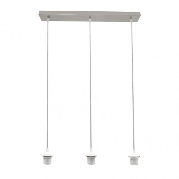 Armazón Regleta de tres luces de la serie NIA de color NIQUEL. Realizada en metal. Posee tres porta lámparas E27. Bombillas no incluidas. Para completar con pantallas o tulipas, pudiendo dejarlas suspendidas a la misma o a diferentes alturas, resultando una bonita composición muy decorativa para dormitorios, comedores, salones y salas de estar e incluso para zonas de trabajo. Sus dimensiones, regulables en altura, son de 15<,105x60x6 centímetros. En esta serie podemos encontrar armazones tanto de plafones como de regletas con tres luces colgantes y de los colores blanco, negro, cromo, cuero, níquel y marrón, para elegir la que mejor se adapte a su decoración.