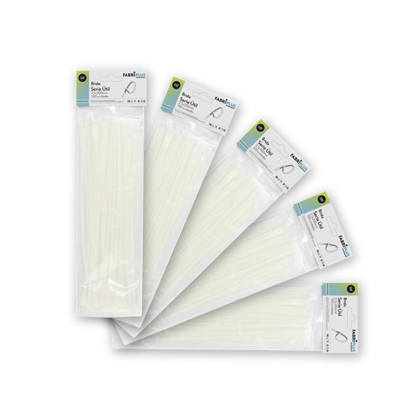 Bolsa de 100 unidades de BRIDAS de la serie UTIL en color BLANCO y con una medida de 2,5mm de ancho x 200mm de largo. Fabricadas en 100% Nylon66, resistentes y duraderas, con materiales según norma UL-94 V2. Resistentes tanto a bajas como a altas temperaturas, desde -35ºC hasta 85ºC. Comúnmente denominada brida, abrazadera, presilla, cincho o corbata, con sistema de auto bloqueo, tanto para interior como exterior, para fijar, sujetar, agrupar cables , tuberías, etc. Muy útil para uso diario. Las podemos encontrar tanto en color blanco como en negro, y de distintas medidas.
