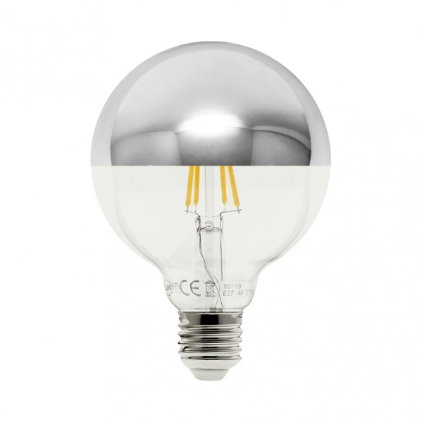 Bombilla reflectora decorativa led serie GLOBO, con filamentos realizada en cristal y mitad decorada en CROMO. Tiene una potencia de 10 watios, 950 lúmenes y 4000k de temperatura de lus, blanco natural. Con portalámpara E27, tiene unas medidas de 17,5×12,5×12,5 centímetros y un peso neto de 25 gramos