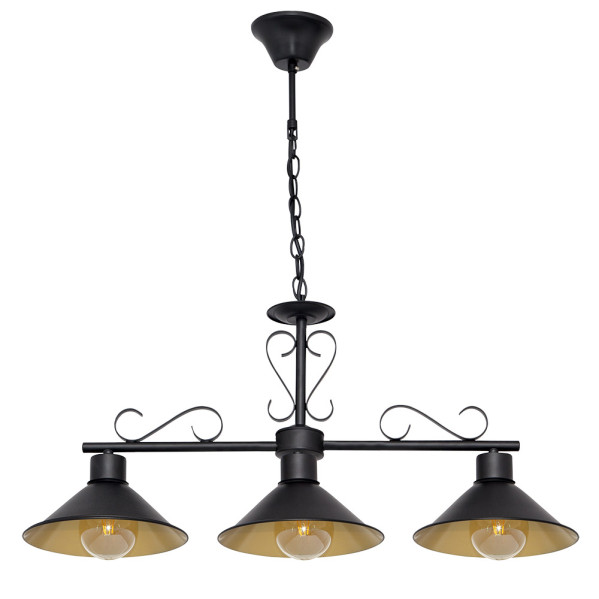 Colgante de tres luces de la serie AZALEA de color NEGRO/ORO. Realizada en metal. Su diseño ofrece una versión sofisticada del estilo rústico, presentando el interior de sus pantallas en color oro y sus tulipas dispuestas de forma lineal. Es ideal para grandes salones de casas de campo u hogares con estilos decorativos afines. Muy aconsejable completar con unas bonitas bombillas decorativas de filamentos vintage, que junto con el color dorado aportan un tono cálido a la estancia que decoran. Posee tres porta lámparas E27. Bombillas no incluidas. Su altura es regulable en altura y presenta una dimensión de 54<,74x86x20 centímetros. En esta misma serie podemos encontrar lámparas de cinco y tres luces y colgantes de tres, dos y una luz.