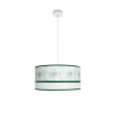 Colgante de diseño con dos luces de la serie CALEDONIA de color BLANCO/VERDE. Realizado en metal y textil. De estilo moderno, presenta en su pantalla un contraste de colores, ribeteada con cinta de terciopelo verde, resultando muy original y decorativo para iluminar en dormitorios, comedores, salones y zonas de trabajo, creando un ambiente fresco y acogedor. Posee dos portalámparas E27. Bombillas no incluidas. Su pantalla tiene un diámetro de 50 centímetros con DIFUSOR INCLUIDO. El colgante, con altura regulable, tiene unas dimensiones de 36<,98x50x50 centímetros. En esta serie, encontramos a juego los colgantes de 30, 40, 50 y 60 centímetros de diámetro, regleta de 3 luces, plafón de 3 luces, lámparas de 2, 3 y 4 luces, el pie de salón, y dos tamaños de sobremesas, todas las versiones combinando el color blanco con el estampado y cinta en verde.