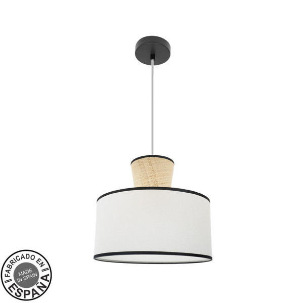 Colgante de una luz de la serie CAMBOYA de color NEGRO y pantalla de diseño BLANCO/NATURAL, ribeteado todo en negro. Realizado en metal, cañizo y textil. Su pantalla se compone de dos cuerpos, uno cilíndrico sobre el que reposa una pantalla cónica invertida más pequeña, resultando una composición muy vistosa y original. De estilo moderno, pero con líneas sencillas, idóneo para ambientes decorados con los nuevos estilos de decoración en los que se mezclan colores y texturas añadiendo a la estancia que iluminan contrastes y calidez en ambientes modernos o industriales y equilibrio a estancias afines como con el estilo Rústico. Muy decorativo, perfecto para combinarse con otras estéticas creando un espacio único y exótico en dormitorios, salones, comedores y zonas de trabajo. Posee un portalámparas E27. Bombilla no incluida. Sus dimensiones, regulables en altura, son de 40×40 centímetros. Podemos adquirir en esta serie a juego colgantes de 40 y 50 centímetros de diámetro, sobremesa, aplique y pie de salón, todos combinando con los colores negro/blanco/natural.