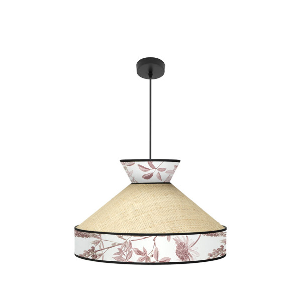 Colgante de la serie CONSTANTINOPLA de color BEIS/ROJO ribeteada con cinta y pendel en NEGRO. Realizado en material textil y metal. Posee un portalámparas E27, bombilla no incluida. Tiene unas dimensiones, regulables en altura, de 40<,70x50x50 centímetros. Pantalla moderna de diseño muy original, tanto por su forma, como por la combinación de colores y texturas de sus tejidos, mezclando tejido estampado con rafia natural, resultando una composición única para decorar cualquier rincón o estancia, poniendo siempre un toque de color y sofisticación. Disponible en esta serie los colgantes de 30, 40 y 50 centímetros de diámetro, regleta y plafón con tres colgantes, dos tamaños de sobremesas y el pie de salón, todos con la combinación en beis/verde o beis/roja, para elegir la que mejor le vaya a su decoración.