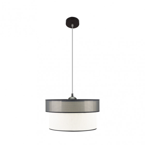 Colgante de la serie FELIX de color NEGRO/BLANCO. Realizado en metal y textil, se compone de dos pantallas, una más estrecha de tela de malla negra que corona la pantalla más ancha de color blanco, todo ribeteado en negro, resultando una bonita combinación de texturas y juego de colores. De estilo moderno y sencillo, a la par que elegante y original, ideal tanto para dormitorios, salones y salas de estar abocadas al descanso, como para comedores y lugares de trabajo. Posee un portalámparas E27. Bombilla no incluida. Tiene unas dimensiones, regulables en altura, de 35<,148x40x40 centímetros, y un peso neto de 810 gramos. En esta serie podemos encontrar tanto el colgante de 40 centímetros de diámetro como el de 50 centímetros de diámetro, disponibles ambas medidas en negro/blanco, negro/rojo y negro/dorado.