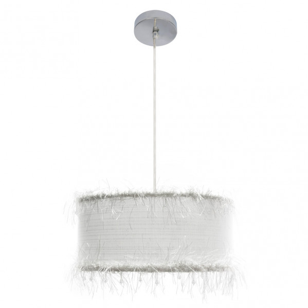 Colgante de la serie HILOS de color BLANCO. Este moderno colgante se caracteriza por una decoración de pasamanería de color blanco. Pantalla y armazón componen un conjunto perfecto para ambientar espacios con cierto toque vintage. Posee un portalámparas E27, bombilla no incluida, y su diámetro es de 40 centímetros. Se puede completar la serie con el colgante de 50 cm y el sobremesa a juego, disponibles en color beis, blanco y negro. Tiene unas dimensiones, regulables en altura, de 40<,100x40x40 centímetros.