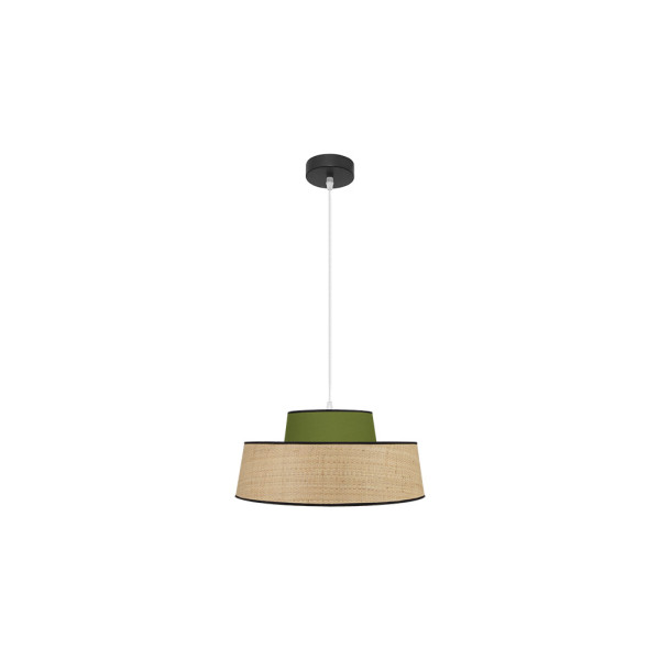 Colgante de la serie JIA de color NATURAL/VERDE. Realizado en metal y textil. De estilo moderno y sencillo, a la par que elegante y original, ideal tanto para dormitorios, salones y salas de estar abocadas al descanso, como para comedores y lugares de trabajo. Posee un portalámparas E27. Bombilla no incluida. Tiene unas dimensiones, regulables en altura, de 47<,110Xx40x40 centímetros, y un peso neto de 660 gramos. En esta serie podemos encontrar tanto el colgante de 50 centímetros de diámetro como el de 40 centímetros de diámetro, y un modelo de sobremesa. También disponibles en los siguientes colores: natural/turquesa, natural/gris, natural/negro, natural/verde, natural/calabaza y natural/blanco.