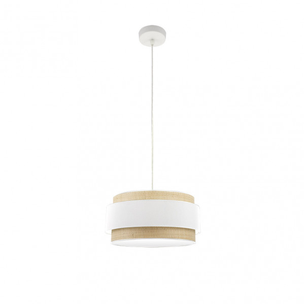 Colgante serie KANDY de color NATURAL/BLANCO de 40 centímetros de diámetro. Posee un portalámparas E27. Bombilla no incluida. Pantalla formada por dos cuerpos en textil y florón metálico de color blanco. De estilo moderno y diseño elegante, ideal para decorar e iluminar en dormitorios, salones y salas de estar, aportando calidez a la estancia que ilumina. Sus dimensiones son regulable en altura, de 42&lt,112x40x40 centímetros. En esta serie podemos encontrar los colgantes de 60, 50, 40 y 30 centímetros de diámetros, dos tamaños diferentes de sobremesas, los apliques, regleta de tres colgantes y el plafón de tres colgantes, todos combinando arpillera natural con textil en color blanco, negro, gris o marrón.