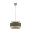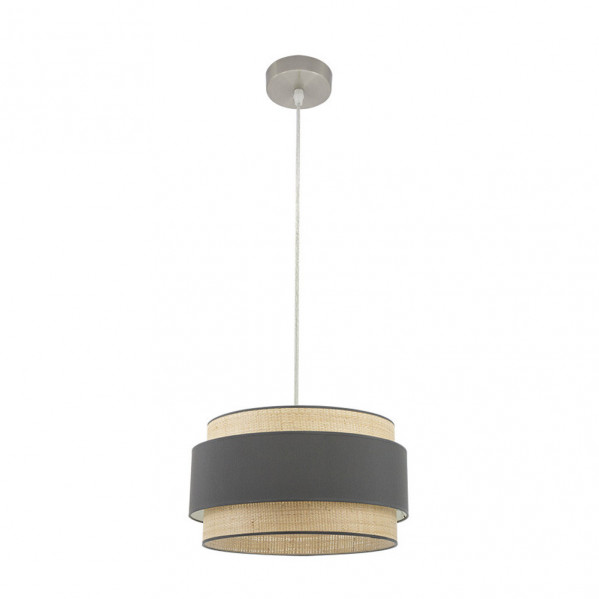 Colgante serie KANDY de color NATURAL/GRIS de 40 centímetros de diámetro. Posee un portalámparas E27. Bombilla no incluida. Pantalla formada por dos cuerpos en textil y florón metálico de color níquel. De estilo moderno y diseño elegante, ideal para decorar e iluminar en dormitorios, salones y salas de estar, aportando calidez a la estancia que ilumina. Sus dimensiones son regulable en altura, de 42<,112x40x40 centímetros. En esta serie podemos encontrar los colgantes de 60, 50 y 40 centímetros de diámetros, dos tamaños diferentes de sobremesas, los apliques y el plafón de tres colgantes, todos combinando arpillera natural con textil en color blanco, negro, gris o marrón.