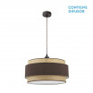 Colgante serie KANDY de color NATURAL/MARRON de 60 centímetros de diámetro. Posee tres portalámparas E27. Bombillas no incluidas. Pantalla formada por dos cuerpos en textil y florón metálico de color marron. De estilo moderno y diseño elegante, ideal para decorar e iluminar en dormitorios, salones y salas de estar, aportando calidez a la estancia que ilumina. Sus dimensiones son regulable en altura, de 50<,120x60x60 centímetros. En esta serie podemos encontrar los colgantes de 60, 50 y 40 centímetros de diámetros, dos tamaños diferentes de sobremesas, los apliques y el plafón de tres colgantes, todos combinando arpillera natural con textil en color blanco, negro, gris o marrón.