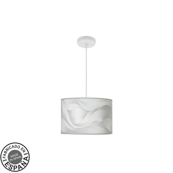 Colgante de una luz de la serie MODA de color BLANCO y pantalla de diseño OLA GRIS. De estilo moderno, pero con líneas sencillas, idóneo para ambientes decorados con los nuevos estilos como el minimalista, Boho Chic o incluso Industrial a juego con el resto de su decoración, mezclando colores y texturas. Aportan calidez a dormitorios, salas de estar y centros de trabajo. Posee un portalámparas E27. Bombilla no incluida. Tiene unas dimensiones, regulables en altura, de 35<,111x30x30 centímetros. Podemos adquirir en esta serie una gran cantidad de productos a juego, con una gran variedad de diseños y colores de pantallas en sus ventiladores, tres tamaños de colgantes, apliques, sobremesas y pies de salón.