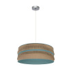 Colgante de la serie NATALIA de color NIQUEL con pantalla confeccionada en tela de SACO y tela de lino rayado de color TURQUESA. Posee un portalámparas E27. Bombilla no incluida. Destaca su pantalla cilíndrica con una doble pasamanería de flecos y cinta de colores al igual que su interior, resultando una serie moderna y muy decorativa. Ideal para dormitorios, entraditas, salones y salas de estar, compatible tanto en decoraciones rústicas como clásicas o vintage. Tiene unas dimensiones, regulables en altura, de 47<,110x50x50 centímetros. En esta serie podemos encontrar colgantes, sobremesas, apliques, plafones y pies de salón, todos combinando el tejido de saco con lino blanco, naranja, negro, beis ó turquesa, y con monturas en negro, blanco, cuero ó níquel.