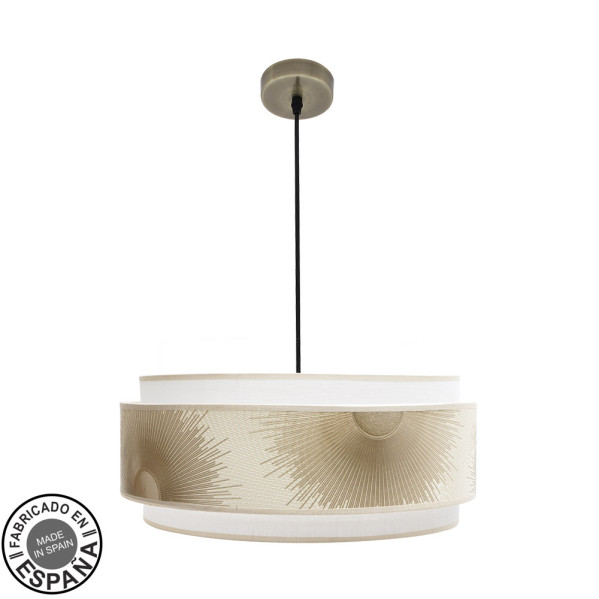 Colgante con tres luces de la serie NEPAL de color CUERO y pantalla de diseño en BLANCO/ORO. Realizado en metal y textil. Su pantalla se compone de tres cuerpos ribeteados, con un bonito estampado en relieve en su pantalla central y combinando el dorado con lino blanco, resultando una composición muy vistosa y original. Viene con DIFUSOR INCLUIDO. De estilo moderno, pero con líneas sencillas, idóneo para ambientes decorados con los nuevos estilos de decoración en los que se mezclan colores y texturas añadiendo a la estancia que iluminan contrastes y calidez en ambientes modernos, idóneo también para ambientes con influencias étnicas. Muy decorativo, perfecto para combinarse con otras estéticas creando un espacio único y exótico en dormitorios, salones, comedores y zonas de trabajo. Posee tres portalámparas E27. Bombillas no incluidas. Sus dimensiones, regulables en altura, son de 30<,102x50x50 centímetros. Podemos adquirir en esta serie una gran cantidad de productos a juego como son colgantes de 50, 40 y 30 centímetros de diámetro con tres o cinco pantallas, dos tamaños de sobremesas, aplique y el pie de salón, todos combinando con los colores cuero/blanco/oro y blanco/blanco/oro para elegir y combinar los que mejor se adapten a su decoración.