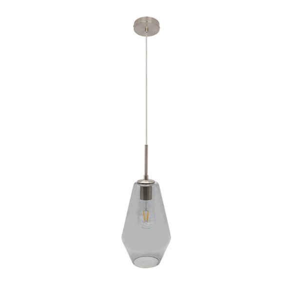 Colgante de una luz de la serie PINAP de color NIQUEL/AHUMADO. Realizado en metal y cristal. Destaca por el diseño moderno y diferente de su tulipa de cristal gris ahumado suspendida. Con un portalámparas en E27, bombilla no incluida. Aconsejable completar con una bonita bombilla de filamentos para preservar su estética. Ideal para salones, comedores dormitorios y salas de estar e incluso para zonas de trabajo. Se pueden crear composiciones diferentes, combinando varios colgantes iguales o con distintos diseños de esta misma serie, resultando ambientes especiales y exclusivos, muy acordes con los nuevos estilos de decoración en el que se combinan texturas y materiales, como en decoraciones Vintage y Boho Chic, aportando personalidad y calidez a la estancia que ilumina. Tiene unas dimensiones, regulables en altura, de 50<,135x17x17 centímetros. Disponibles en esta serie varios diseños de colgantes según la forma de sus tulipas y todas también en cuero con ámbar.