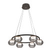 Colgante de seis luces de la serie POMPEYA en color NEGRO. Realizado en metal y cristal. Destacan sus tulipas que presentan un diseño muy original y moderno, con cristal fumé transparente dejando apreciar la colina de luces LED de su interior. Sus tulipas se encuentran suspendidas en disposición circular creando así una composición muy decorativa. Posee TECNOLOGIA LED INTEGRADA con una potencia de 42 watios, 3780 lúmenes y TRES TEMPERATURAS SELECCIONABLES de luz 3000k, 4000k y 6000k (luz cálida, blanco natural y blanco frío). Viene con MANDO A DISTANCIA incluido y REGULADOR DE INTENSIDAD, pudiendo crear así varios ambientes dependiendo de la actividad a desarrollar. Ideal para decoraciones modernas aptas para iluminar en salones y comedores, e incluso en zonas de trabajo. Tiene unas dimensiones regulables en altura, de 15<,160x67x67 centímetros. Encontramos una gran variedad de lámparas y colgantes de 3, 4, 5 y luces, para elegir la combinación que mejor se adapte a su decoración.