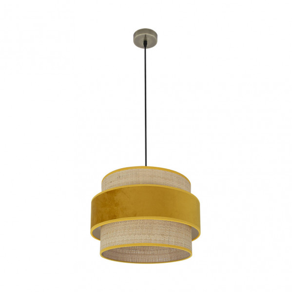Colgante de diseño de la serie REYES de color CUERO con pantalla NATURAL/YEMA. Realizado en metal y textil. De estilo moderno, presenta en su pantalla un contraste de colores y texturas al combinar el terciopelo con tela de arpillera natural, resultando muy original y decorativo para iluminar en dormitorios, comedores, salones y zonas de trabajo, creando un ambiente diferente. Posee un portalámparas E27. Bombilla no incluida. Su pantalla tiene un diámetro de 40 centímetros, colgante con altura regulable, tiene unas dimensiones de 47<,110x40x40 centímetros. En esta serie, encontramos a juego los colgantes de 30,40,50 y 60 centímetros de diámetro, el pie de salón, apliques y dos tamaños de sobremesas, todas las versiones combinando la arpillera natural con terciopelo de color marrón, rojo, verde ó yema, una amplia gama para elegir el que mejor se adapte a su decoración dando un toque de color a la estancia que ilumina.