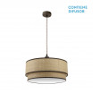 Colgante serie ROQUE de color NATURAL/MARRON de 60 centímetros de diámetro. Posee tres portalámparas E27. Bombillas no incluidas. Pantalla formada por dos cuerpos en textil y enfilaje y florón metálico de color marrón. Sus dimensiones son regulable en altura, de 35<,110x60x60 centímetros. En esta serie podemos encontrar los colgantes de 60, 50 y 40 centímetros de diámetros, dos tamaños diferentes de sobremesas y los apliques, todos realizados en arpillera natural ribeteados en color negro, rojo o marrón.
