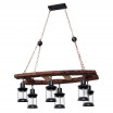 Colgante rústico de seis luces serie FINCA en color NEGRO y MARRÓN. Realizado en metal, madera y cristal. De estilo rústico, combinando el metal con la madera, típico de decoraciones de casas de campo, cortijos y fincas, ideal también para bares, salones de celebraciones, ventas y bodegas. De diseño muy original combinando la estructura rectangular de madera con los faroles que cuelgan, haciéndose el centro de la estancia que ilumina. Posee seis portalámparas E27. Bombillas no incluidas. Su dimensión es regulable en altura de 60<,90x78x40 centímetros. En esta familia podemos encontrar varios modelos con diferentes diseños y tamaños para realizar la composición rústica perfecta.