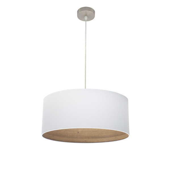 Colgante de la serie TATIANA de color NIQUEL con pantalla de color BLANCO y MADERA CLARA en su interior. Posee un portalámparas E27. Bombilla no incluida. Tiene unas dimensiones, regulables en altura, de 47<,110x50x50 centímetros. Serie muy decorativa, acorde con estilos tanto modernos, vintage ó rústicos, como estilos minimalistas y para zonas costeras abocadas al descanso, por los colores maderas del interior de sus pantallas. Con una gran variedad de artículos en esta serie que aportan sofisticación y elegancia a salones, dormitorios, comedores y salas de estar, todos combinando con armazones níquel, encontramos a juego los colgantes de 50, 40 y 30 centímetros de diámetro, dos tamaños diferentes de sobremesas, aplique, plafones de 48, 72 y 96 watios y el pie de salón, cubriendo cualquier necesidad de iluminación en su hogar o lugar de trabajo.