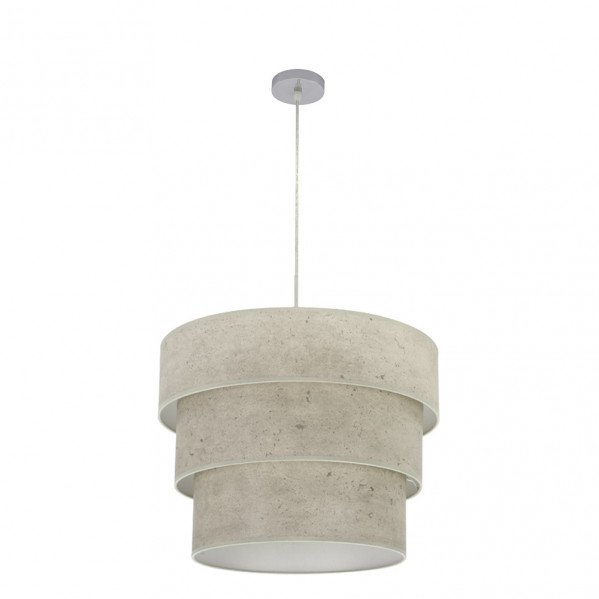 Colgante de la serie SMILE de color CROMO/CEMENTO GRIS de 50 centímetros de diámetro. Realizado en metal y textil. Posee tres portalámparas E27. Bombillas no incluidas. Su pantalla está formada por tres cuerpos dispuestas por tamaños descendentes de mayor a menor, resultando una composición de diseño muy original y moderno, recordando a la madera, ideal para decorar en salones, comedores y espacios de trabajo haciéndose el centro de la estancia que ilumina. Sus dimensiones son regulable en altura, de 54<,117x50x50 centímetros. En esta serie podemos encontrar los colgantes de 50 y 40 centímetros de diámetros, sobremesas, apliques y pies de salón, todos realizados en tejidos que nos recuerdan a madera clara, madera oscura, madera gris, óxido y madera negra.