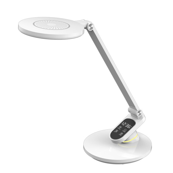 Flexo Led de la serie HAMLET en color BLANCO. Realizado en ABS. De diseño moderno y elegante con líneas sencillas, articulable, plegable y orientable, ideal para cualquier tipo de mesa de estudio, lectura o de trabajo. Táctil,  tiene una potencia de 10 watios, 800 lúmenes y con TRES TEMPERATURAS SELECCIONABLES DE COLOR DE LUZ, 3000-4500-6000ºK (cálido, Natural y Frío). Dispone en su estructura una LUZ DE NOCHE o quitamiedos, con LCD DISPLAY donde podemos apreciar la hora, y con posibilidad de ajustar el tiempo de descanso 15/30/45 minutos, pasado el tiempo programado reproduce una alarma sonora y parpadea unos segundos para informar que el tiempo ha pasado. Con REGULADOR DE INTENSIDAD para lograr la cantidad de luz deseada acorde con la actividad a realizar, ANTI-REFLEJO SIN PARPADEOS sin flashes ni parpadeos, tipo de lámpara muy aconsejable para el descanso ocular, MEMORIA DE COLOR. Tiene una dimensión de 44,3×19,1x28,3 centímetros.