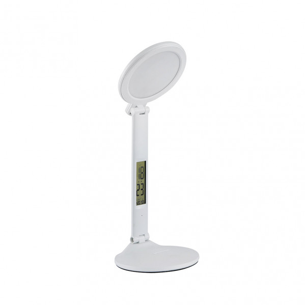 Flexo Led de la serie HOPE en color BLANCO. Realizado en metal, policarbonato y acrílico, suave al tacto. De diseño moderno y elegante de líneas sencillas, con cabeza y base redondas, ideal para cualquier tipo de mesa de estudio, lectura o de trabajo. Con cabeza y cuerpo plegable. TÁCTIL pudiendo cambiar de temperatura de luz con pequeños toques o dejándolo pulsado para variar la intensidad de la luz. DIGITAL, con display donde marca FECHA, HORA, Y TEMPERATURA. Tiene una potencia de 7 watios, 525 lúmenes y con tres temperatura de luz de 3000-4000-6000ºK (Cálido, Blanco Natural y Blanco frío). Con REGULADOR DE INTENSIDAD para regular la cantidad de luz deseada acorde con la actividad a realizar, tipo de lámpara muy aconsejable para el descanso ocular. En su base se aprecia un fino tope para reposar dispositivos móviles. Tiene unas dimensiones de 40x16,5×18,5 centímetros.