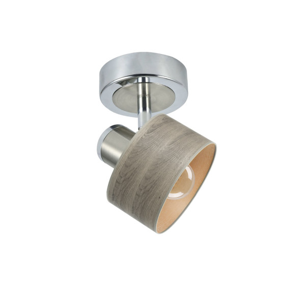 Foco de la serie NANDO de color CROMO/NIQUEL con pantallas color MADERA GRIS. Realizada en metal y textil con un portalámparas E14. Bombilla no incluida. De diseño muy original y moderno, el foco es articulable verticalmente y con un giro en el eje horizontal de casi 360º, permitiendo así dirigir la luz hacia cualquier punto de la estancia. El color y textura de su pantalla, simulando madera, lo hace apto para decoraciones naturales y rústicas, aunque también muy acorde con estilos de decoración minimalista y vintage. Tiene unas dimensiones de 17x12x12 centímetros. En esta serie encontramos a juego las regletas de cuatro, tres y dos luces, el foco de una luz y el plafón de tres luces.