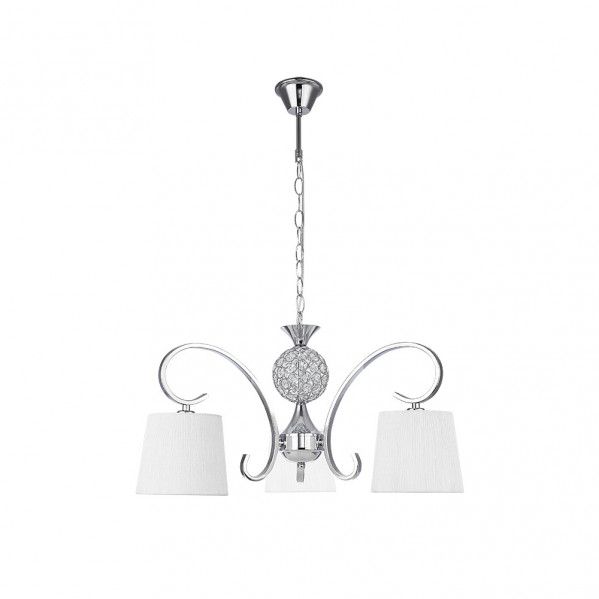 Lámpara de tres luces serie BOGOTA de color CROMO con pantallas BLANCAS. Está realizado en metal, cristal y textil. Sus dimensiones, de altura regulable, son de 55<,76x57x57 centímetros. Presenta un diseño muy elegante, con brazos curvos y decorado en el cuerpo central con una pequeña bola de cristales, ideal para salones, dormitorios y salas de estar acordes con decoraciones clásicas y vintage. Posee tres portalámparas E14. Bombillas no incluidas. En esta serie tenemos disponible el sobremesa, aplique, pie de salón y las lámparas de ocho, cinco y tres luces, tanto en color cromo como en color cuero, también a juego con la serie PANAMA.