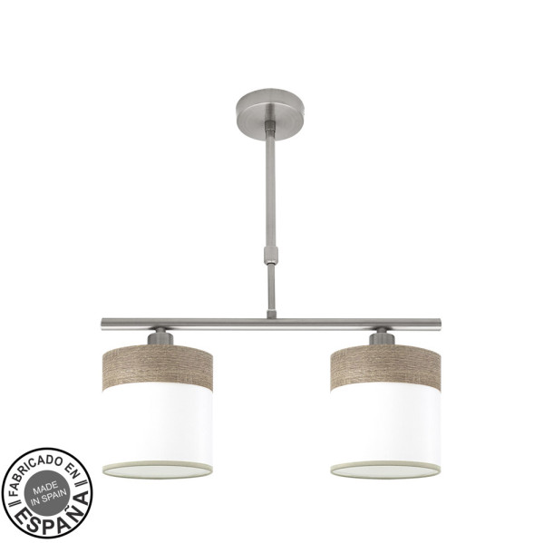 Lámpara de diseño de la serie CLOE de color NÍQUEL con pantalla BLANCA/MADERA GRIS. Realizado en metal y textil. De estilo moderno, presenta en su pantalla un contraste de colores, resultando muy original y decorativo para iluminar en dormitorios, comedores, salones y zonas de trabajo, creando un ambiente diferente. Posee dos portalámparas E14. Bombillas no incluidas. La lámpara tiene unas dimensiones, regulables en altura, de 44<,61x43x14 centímetros. En esta serie, encontramos a juego los colgantes de 40 y 50 centímetros de diámetro, regleta de 3 luces, plafón de 3 luces, lámparas de 2, 3 y 4 luces, el pie de salón, y un tamaño de sobremesa, todas las versiones combinando el color blanco con los colores de madera: madera clara, madera oscura, madera gris y madera negra. Una amplia gama para elegir el que mejor se adapte a su decoración dando un toque de color a la estancia que ilumina.