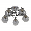 Lámpara de cinco luces de la serie ETNA, realizada en metal y cristal de color CROMO/WENGUE. Su diseño moderno, destaca por la combinación en su estructura del wengué con el cromo, relacionando lo rústico del color de la madera con lo moderno del metal, y por el diseño de sus tulipas fumé simulando un panal, con lo que resulta una composición muy bonita y original, ideal para decorar en salones, dormitorios y salas de estar. Tiene cinco porta lámparas en E14, y unas dimensiones de 23x46x46 centímetros. Bombillas no incluidas. En esta serie encontramos la lámpara de cinco, tres y dos luces y el sobremesa a conjunto. Todos ellos también en color cuero/roble.