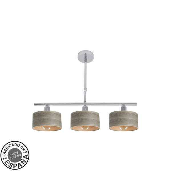 Lámpara de tres luces de la serie GILDA de color CROMO/MADERA GRIS. Está realizado en metal y pantallas de material textil. Posee tres porta lámparas E14. Bombillas no incluidas. De diseño moderno, predominan sus pantallas con tejidos de colores madera, muy acorde para decoraciones naturales, minimalistas y también compatible con ambientes Vintage. Ideales para iluminar en dormitorios, salones, comedores y zonas de trabajo. Tiene unas dimensiones, regulable en altura, de 39<,56x55x14 centímetros. Disponible en esta serie lámparas de cuatro, tres y dos luces, todas en colores blanco/madera clara, cuero/madera oscura, cromo/madera gris y marrón.