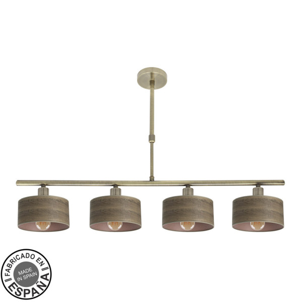 Lámpara de cuatro luces de la serie GILDA de color CUERO/MADERA OSCURA. Está realizado en metal y pantallas de material textil. Posee cuatro porta lámparas E14. Bombillas no incluidas. De diseño moderno, predominan sus pantallas con tejidos de colores madera, muy acorde para decoraciones naturales, minimalistas y también compatible con ambientes Vintage. Ideales para iluminar en dormitorios, salones, comedores y zonas de trabajo. Tiene unas dimensiones, regulable en altura, de 39<,56x76x14 centímetros. Disponible en esta serie lámparas de cuatro, tres y dos luces, todas en colores blanco/madera clara, cuero/madera oscura, cromo/madera gris y marrón.