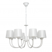 Lámpara serie Guadalajara de color blanco/blanco. Está realizada en metal y textil. Forma parte de una familia muy completa compuesta por sobremesa, aplique, lámpara de cinco luces y tres luces en color blanco, cromo y cuero. Sus dimensiones son 62<,92x72x72 cm con altura regulable. Su peso neto es de 2640 g. Posee ocho portalámparas E14.