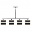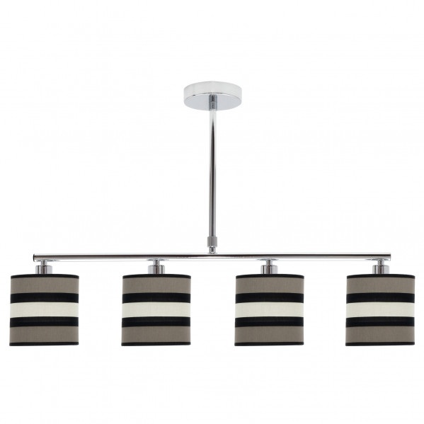 Lámpara de cuatro luces de la serie KARLA de color CROMO con pantalla TOPO/BEIS y vivo en negro. Realizada en metal y material textil. Destacan sus pantallas, por su diseño moderno y la combinación de sus colores. Composición muy elegante compatible con el nuevo estilo Vintage, ideal para iluminar en dormitorios, comedores, salones, despachos y salas de estar. Posee cuatro portalámparas E14. Bombillas no incluidas. Su dimensión, regulable en altura, es de 44&lt,61x75x14 centímetros. En esta misma serie podemos encontrar a juego los colgantes de 40, 50 y 60 centímetros de diámetro, dos medidas de sobremesas, el pie de salón y lámparas de cuatro, tres y dos luces, todos los modelos también en color blanco/beis.