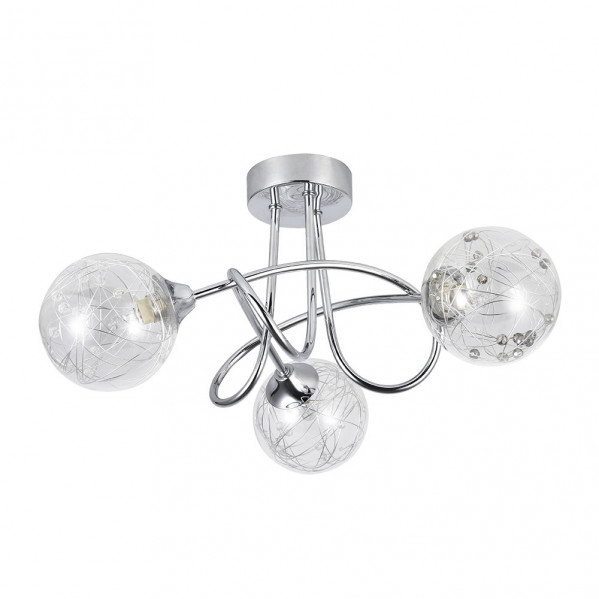 Lámpara de tres luces serie RIO DE JANEIRO, realizada en metal color CROMO y tulipas de cristal y metal. Diseño moderno y muy original, resaltando además de la estructura sus tulipas, dónde el cristal transparente deja ver el entresijo de hilos metálicos con pequeñas lágrimas de cristal de su interior, resultando una composición muy especial para decorar salones y dormitorios con un toque muy personal. Tiene una dimensión de 21x37x37 centímetros y un peso neto 650 gramos. Posee tres porta lámparas G9. Bombillas no incluidas. Puede completar la decoración de su hogar con la lámpara de cinco luces y el sobremesa. Disponibles también en color cuero