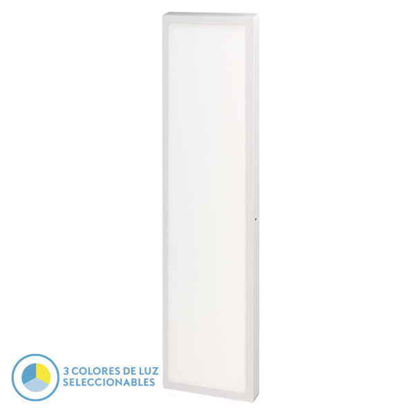 Panel de superficie de la serie LLANO en color BLANCO. Realizado en aluminio y policarbonato. Tiene una potencia de 72 watios, 7200 lúmenes y SELECCIONABLE EN EL MONTAJE en TRES TEMPERATURAS DE LUZ, 3000-4000-6500K (luz cálida, natural ó blanco frío). Tiene una medida de 3,8x30x120 centímetros. En esta serie podemos encontrar varios tamaños de paneles de superficie, con sus correspondientes potencias de 72w,48w y 36w, todos con 3000-4000-6500k, tanto en color blanco como en níquel.