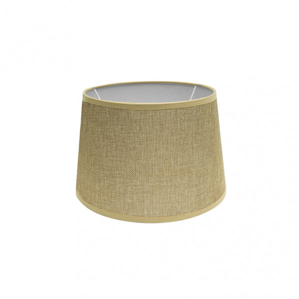 Pantalla cónica abierta serie IRENE de color BEIS. Realizado en material textil saco-yute. Diseñada para un portalámparas E27. Sus dimensiones son de 25x20x15 centímetros y un peso neto de 165 gramos. También en varios tamaños, desde 45 a 10 centímetros de diámetro.
