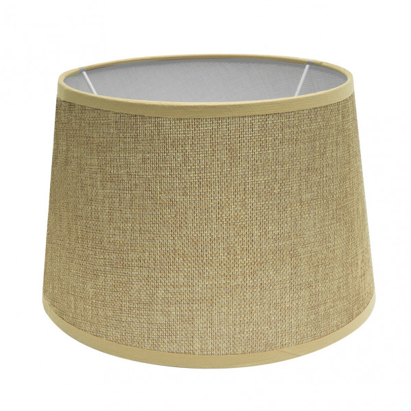 Pantalla cónica abierta serie IRENE de color BEIS. Realizado en material textil saco-yute. Diseñada para un portalámparas E27. Sus dimensiones son de 40x30x25 centímetros y un peso neto de 325 gramos. También en varios tamaños, desde 45 a 10 centímetros de diámetro.
