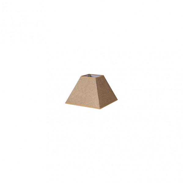 Pantalla piramidal con base cuadrada de la serie DIVOS de color MARRON. Realizado en material textil saco-yute. Diseñada para un portalámparas E27. Sus dimensiones son de 15Dx8dx11h centímetros. Disponible en varios tamaños.