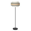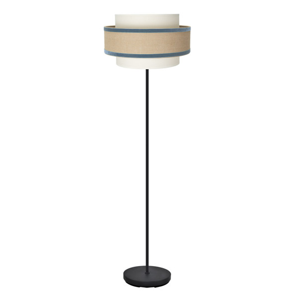 Pie de Salón de la serie CORNALINA con pantalla de color BEIS/AZUL combinando con tejido de saco de 40 centímetros de diámetro. Posee un portalámparas E27. Bombilla no incluida. Pantalla formada por tres cuerpos en textil, uno de ellos con tela de saco y ribeteada en terciopelo de color azul, que junto con su montura en color negro resulta una composición muy bonita y original. De estilo moderno y diseño elegante, ideal para decorar e iluminar en dormitorios, salones y salas de estar, aportando calidez a la estancia que ilumina. Sus dimensiones son de 166x40x40 centímetros. En esta serie podemos encontrar los colgantes de 50, 40 y 30 centímetros de diámetro, dos tamaños diferentes de sobremesas, el aplique y el pie de salón, todos combinando tejido de saco con textil y terciopelo en colores beis/negro, beis/azul y beis/verde.