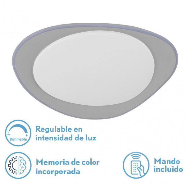 Plafón serie DAIRE en color BLANCO/GRIS. Realizado en metal y policarbonato, de diseño muy original y exclusivo, aportando un aire de elegancia y sofisticación a la estancia que ilumina. Este plafón posee una TECNOLOGÍA LED INTEGRADO con 72 watios de potencia, 5616 lúmenes y TRES TEMPERATURAS DE LUZ (3000ºK-4000ºK-6500ºK), luz cálida, blanco neutro y blanco frío, con REGULADOR DE INTENSIDAD facilitando así un gran ahorro de energía. Muy decorativo, con MANDO A DISTANCIA Y MEMORIA DE COLOR. Este plafón tiene también la opción en el mando de APAGADO CON RETARDO, es decir, una vez lo seleccione, espera 30 segundos a que salga de la estancia para apagarse. Sus dimensiones son 7x55x55 centímetros y su peso neto es de 1580 gramos. Disponibles en esta misma serie el plafón de 48 watios de potencia y también disponibles en Blanco/Oro.