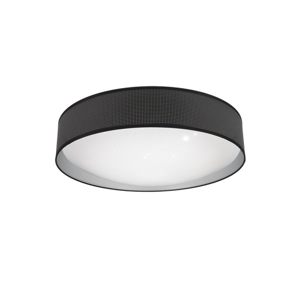 Plafón de la serie ANASTASIA de color NEGRO con pantalla confeccionada con tejido perforado de color NEGRO/PLATA. Compuesto por pantalla y plafón de la serie CALIGULA. Este plafón posee una TECNOLOGÍA LED INTEGRADO con 96 watios de potencia, 7488 lúmenes y TRES TEMPERATURAS DE LUZ SELECCIONABLES DESDE EL INTERRUPTOR DE LA LUZ (3000ºK-4000ºK-6500ºK), luz cálida, blanco neutro y blanco frío, con lo que aporta un gran ahorro de energía. Destaca su pantalla cilíndrica perforada con plata en su interior. Estilo muy original y moderno, ideal para decorar e iluminar en entraditas, salones, despachos y dormitorios, aportando sofisticación a la estancia que ilumina. Apto para decoraciones Industriales, muy acorde también con estilos modernos que tienen la iluminación como elemento característico. Tiene unas dimensiones de 17x59x59 centímetros. En esta serie podemos encontrar los colgantes de 50, 40 y 30 centímetros de diámetro, dos tamaños diferentes de sobremesas, aplique, plafones de 48, 72 y 96 watios y el pie de salón, todos combinando el metal de sus armazones en negro con el textil perforado de sus pantallas negro/plata.