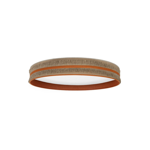 Plafón de la serie NATALIA con pantalla confeccionada en tela de SACO y lino rayado NARANJA. Compuesto por pantalla y plafón de la serie CALIGULA. Posee TECNOLOGÍA LED INTEGRADO con 96 watios de potencia, 7488 lúmenes y TRES TEMPERATURAS DE LUZ SELECCIONABLES DESDE EL INTERRUPTOR DE LA LUZ (3000ºK-4000ºK-6500ºK), luz cálida, blanco neutro y blanco frío, con lo que aporta un gran ahorro de energía. Destaca su original pantalla cilíndrica con una doble pasamanería de flecos y cinta de colores al igual que su interior, resultando una serie moderna y muy decorativa. Ideal para dormitorios, entraditas, salones y salas de estar, compatibles tanto con decoraciones rústicas como clásicas o vintage. Tiene unas dimensiones de 13x60x60 centímetros. En esta serie podemos encontrar colgantes, sobremesas, apliques, plafones y pies de salón, todos combinando el tejido de saco con lino blanco, naranja, negro, beis ó turquesa, y con monturas en negro, blanco, cuero ó níquel.