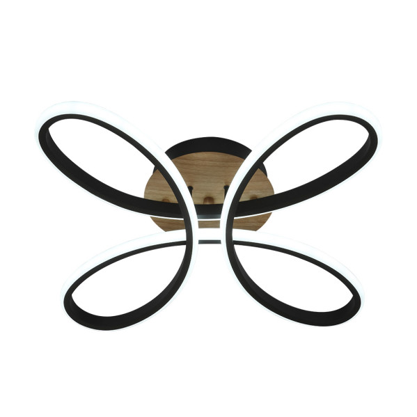 Plafón de la serie BANDEIRA en color NEGRO/MADERA. Realizado en metal, aluminio y acrílico. De diseño futurista muy moderno a la par que elegante, se caracteriza por sus formas curvas y replegadas en cuatro extremos sobre una pletina en color madera, resultando un original y bonito juego lumínico. Ideal tanto para salas, salones, estancias diáfanas y dormitorios como para espacios de trabajo, dando sensación de profundidad, iluminan con una gran fuente de luz a la vez que decoran la estancia, el diseño de luces que presentan lo hacen el centro de la habitación que iluminan. Posee tecnología LED INTEGRADA, proporcionando un gran ahorro, con una potencia de 104 vatios y 11440 lúmenes, con TRES TEMPERATURAS SELECCIONABLES DE LUZ, 3000-4000-6500ºK (luz cálida, natural y blanco frío) pudiendo elegir en cada momento la que mejor se adapte a la actividad a realizar. Viene con MANDO A DISTANCIA incluido, REGULABLE EN INTENSIDAD y MEMORIA de color. Tiene unas dimensiones de 12×42,5×42,5 centímetros. Disponible en esta serie de varios diseños de 88w, 104w y 130w para elegir a juego la combinación de ellos que mejor se adapte a su decoración, todos en color blanco/haya y en negro/madera.
