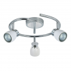 Plafón con tres focos de la serie CHACHO de color BLANCO/CROMO. Realizado en metal con tres portalámparas GU10 . Bombillas no incluidas. De diseño moderno y original dispuestos en círculo con focos articulables verticalmente y con un giro horizontal de casi 360º permitiendo así dirigir los puntos de luz hacia cualquier zona de la estancia. Sus dimensiones son 14X30X30 centímetros. Modelo también disponible en color níquel/cromo y cuero. Se puede completar la colección con la versión de regleta de cuatro luces, regleta de tres luces, regleta de dos luces y foco de una luz.