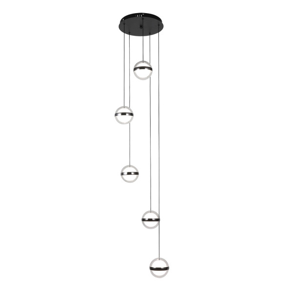 Plafón colgante de cinco luces de la serie PEOPLE en color NEGRO. Realizado en metal y acrílico. Destacan sus tulipas esféricas colgantes presentando un diseño muy original y moderno. Este plafón permite colocar sus tulipas suspendidas en disposición circular y a distintas alturas, creando así una composición muy decorativa. Posee TECNOLOGIA LED INTEGRADO con una potencia de 140 vatios, 10920 lúmenes y TRES TEMPERATURAS SELECCIONABLES de luz 3000k, 4000k y 6000k (luz cálida, blanco natural y blanco frío). Viene con MANDO A DISTANCIA incluido y REGULADOR DE INTENSIDAD, pudiendo crear así varios ambientes dependiendo de la actividad a desarrollar. Ideal para decoraciones modernas aptas para iluminar en salones y comedores, e incluso en zonas de trabajo. Tiene unas dimensiones regulables en altura, de 175&lt,180x35x35 centímetros. Encontramos en esta serie plafones colgantes con 5 y 7 luces, para elegir la combinación que mejor se adapte a su decoración.