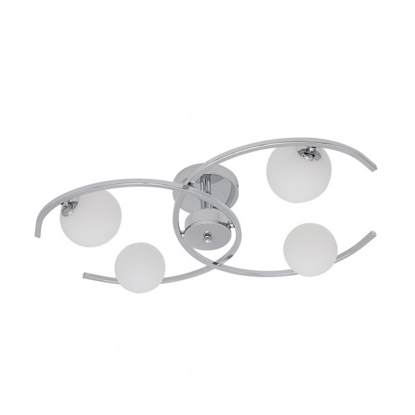 Plafón de cuatro luces de la serie CONIL, realizada en metal color CROMO y tulipas de cristal blanco. Con un cuerpo de diseño moderno resulta una composición muy original y decorativa. Ideal para salones, dormitorios, entradas y salas de estar. Posee cuatro porta lámparas G9. Bombillas no incluidas. Tiene una dimensión de 16x58x37 centímetros. En esta serie podemos encontrar plafón de seis, cuatro y tres luces, el aplique y el sobremesa a juego. También combinable con la serie TONGA.