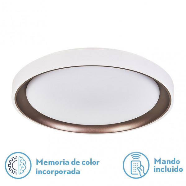 Plafón redondo LUANDA en color BLANCO/MARRON. Realizado en metal y difusor blanco de policarbonato, de diseño muy original y exclusivo, aportando un aire de elegancia y sofisticación a la estancia que ilumina. Este plafón posee una TECNOLOGÍA LED INTEGRADO con 72 watios de potencia, 7200 lúmenes y TRES TEMPERATURAS DE LUZ (3000ºK-4000ºK-6000ºK), luz cálida, blanco neutro y blanco frío, con REGULADOR DE INTENSIDAD facilitando así un gran ahorro de energía. Muy decorativo, con MANDO A DISTANCIA Y MEMORIA DE COLOR. Este plafón tiene también la opción en el mando de APAGADO CON RETARDO, es decir, una vez lo seleccione, espera 30 segundos a que salga de la estancia para apagarse. Sus dimensiones son 7×49,5×49,5 centímetros y su peso neto es de 1455 gramos. Disponibles en esta misma serie el plafón de 96 watios de potencia y también disponibles en Blanco/Gris y Blanco/Oro.