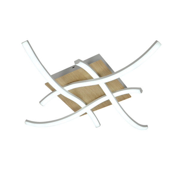 Plafón de la serie MURRAY en color BLANCO/HAYA. Realizado en metal, aluminio y acrílico. De diseño futurista muy moderno a la par que elegante, se aprecian cuatro ondas de luz entrelazadas sobre una pletina en madera, resultando un bonito juego lumínico. Ideal tanto para salas, salones y dormitorios como para cocinas y espacios de trabajo, dando sensación de profundidad, iluminan a la vez que decoran la estancia, el diseño de luces que presentan lo hacen el centro de la habitación que iluminan. Posee tecnología LED INTEGRADA, proporcionando un gran ahorro, con una potencia de 80 vatios y 8800 lúmenes, con TRES TEMPERATURAS SELECCIONABLES DE LUZ, 3000-4000-6500ºK (luz cálida, natural y blanco frío) pudiendo elegir en cada momento la que mejor se adapte a la actividad a realizar. Viene con MANDO A DISTANCIA incluido, REGULABLE EN INTENSIDAD y MEMORIA de color. Tiene unas dimensiones de 10,5×62,5×62,5 centímetros. Disponible en esta serie con tres diseños diferentes y todos en blanco/haya o en negro/madera, para elegir las combinaciones que mejor se adapten a su decoración.