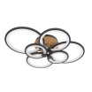 Plafón led serie SYDNEY en color NEGRO/MADERA OSCURA. Se compone de seis círculos de distintos diámetros y superpuestos a distintas alturas, resultando una muy moderna composición. Su tecnología es de LED INTEGRADO con 134 watios de potencia, 18090 lúmenes y los tres tipos de temperatura de luz seleccionables, 3000-4000-6500k (luz cálida, natural y blanco frío) . Con REGULADOR DE INTENSIDAD, MANDO A DISTANCIA y MEMORIA DE COLOR. Muy decorativo haciéndose el centro de la estancia que ilumina, sus dimensiones son de 17x74x57 centímetros. Está realizado en metal y policarbonato. Disponible en esta serie hasta tres tamaños y diseños diferentes y el aplique, todos en los colores cromo, blanco/madera clara y negro/madera oscura.